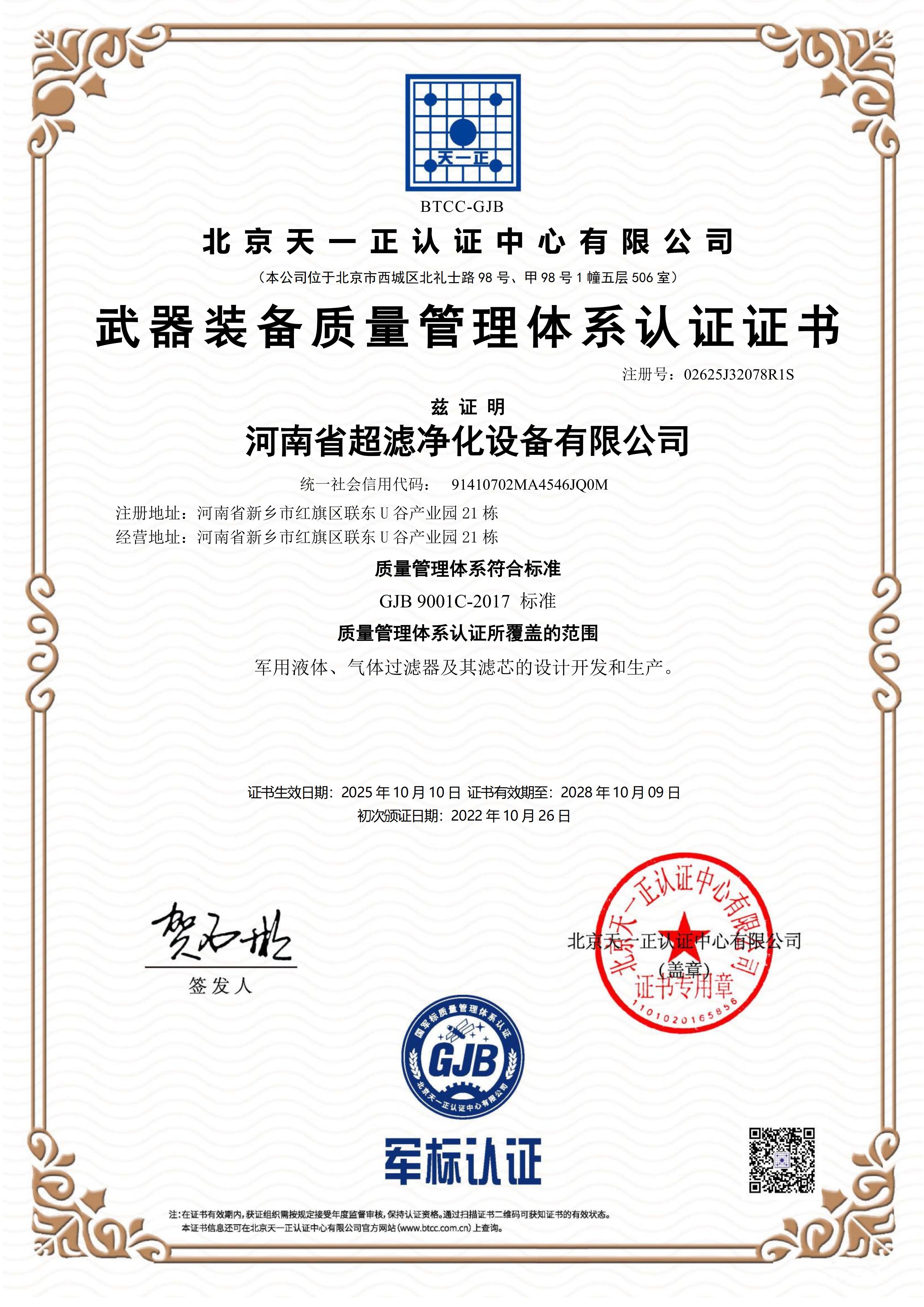 公司是過濾與分離行業(yè)協(xié)會會員單位,秉承“以質(zhì)量求生存,靠創(chuàng)新謀發(fā)展”的指導(dǎo)思想,始終把產(chǎn)品質(zhì)量放在前位,不斷進取,持續(xù)改進,精益求精,按照ISO9001標準建立了一套完善的質(zhì)量保證管理體系,2022年通過了國 軍標《GJB9001C-2017》質(zhì)量體系認證,使公司的產(chǎn)品質(zhì)量得到提升,也將規(guī)范公司的管理,為客戶提供更多的、穩(wěn)定的高品質(zhì)產(chǎn)品。